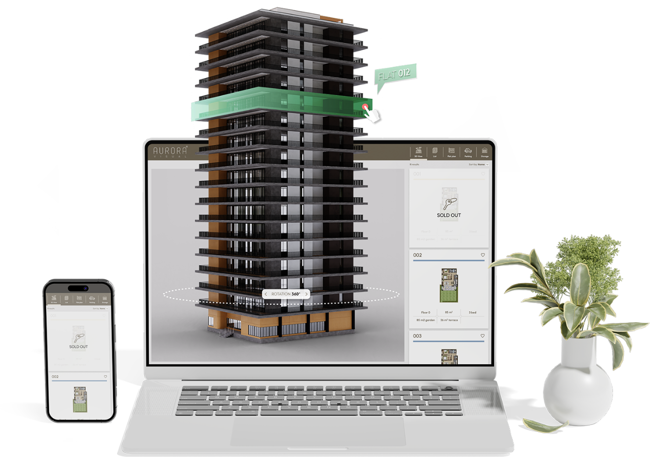 Ideal solution for small developments and early project launches. Fully web-based, works on any device, and easy to embed anywhere. Includes CRM connection and booking feature for direct inquiries.